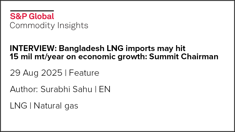Bangladesh’s LNG imports could reach 15 million mt/year in the coming years once the South Asian country achieves a 6%-7% gross domestic product growth, Summit Group Chairman Muhammed Aziz Khan told S&P Global Commodity Insights in an interview.